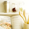 Description: wooden kitchen utensils and some jars set aganins a propped opencookbook