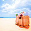 Description: staw bag on a sandy beach, sunglasses peeking out of the bag