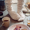 Description: female feet wearing chuncky woolen socks, next to them there is a mug of coffee or possibly tea and an empty and d plate