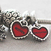 Description: Close up of two heart-shaped charms on a bracelet, one reads 'mother', the other 'daughter.